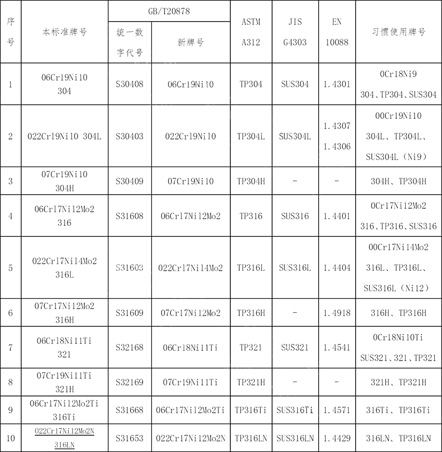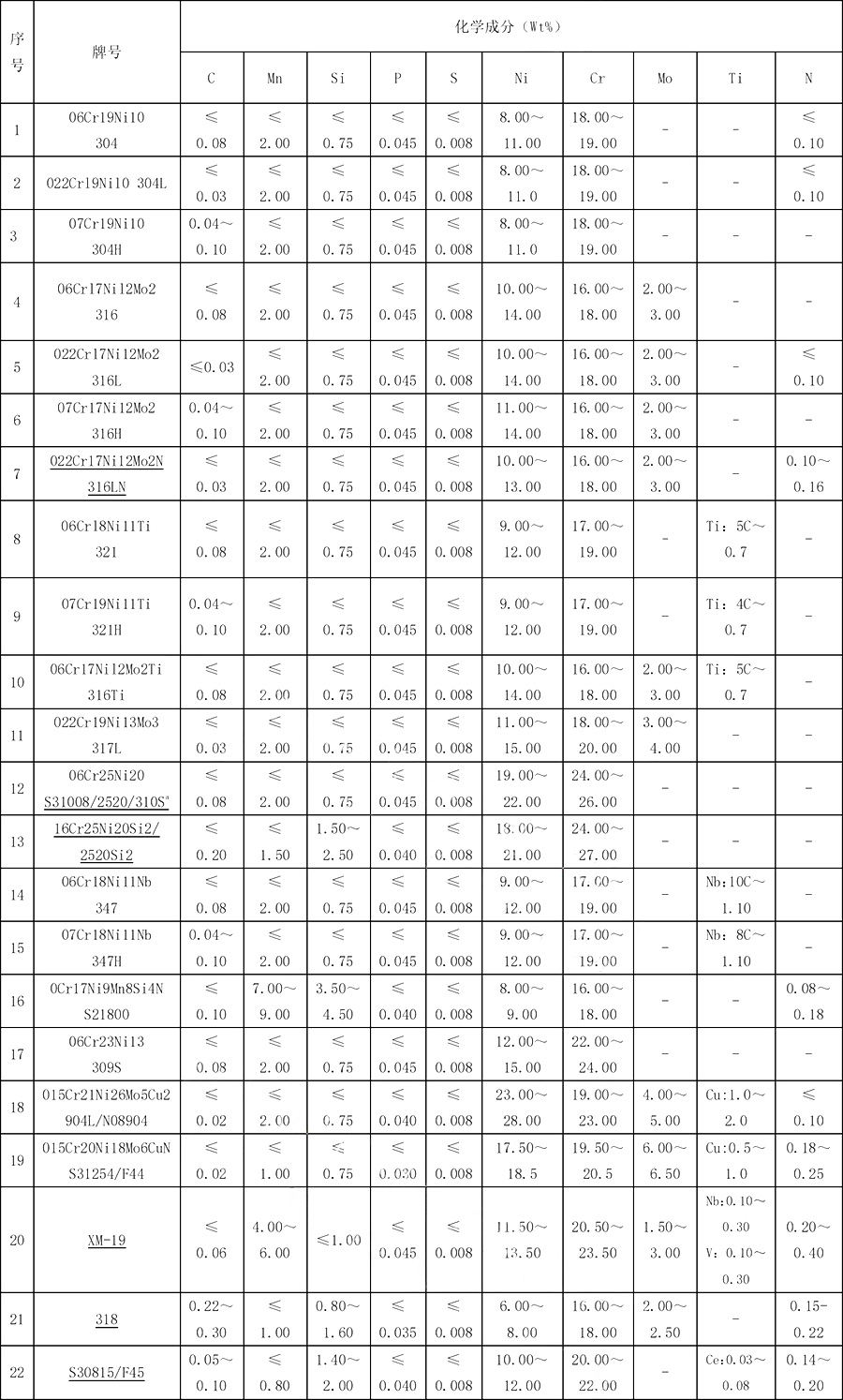 表1 奧氏體不銹鋼牌號及化學(xué)成分